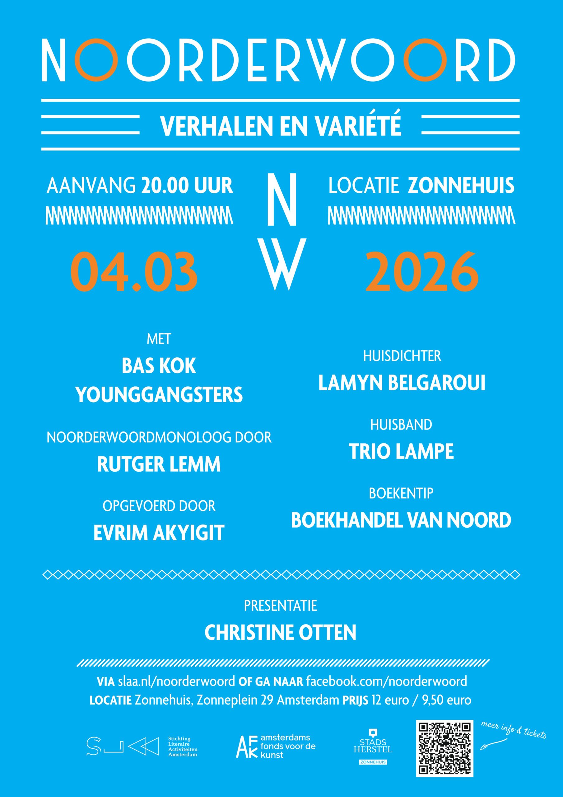 Als altijd laat huisdichter Lamyn Belgaroui zich inspireren door alles wat er op het podium gebeurt en brengt hij aan het eind van de avond een vers geschreven gedicht. Huisband Trio Lampe geeft weer acte de présence en Boekhandel van Noord is aanwezig met een boekentafel en geeft boekentips! Zoals altijd is de presentatie in de handen van schrijver en Noordbewoner Christine Otten. Christine Otten brak door in 2004 met de grote roman De laatste dichters die genomineerd werd voor de Libris Literatuur Prijs, bewerkt voor theater en is vertaald in het Engels. In 2024 verscheen haar roman Als ik je eenmaal mijn verhaal heb verteld.